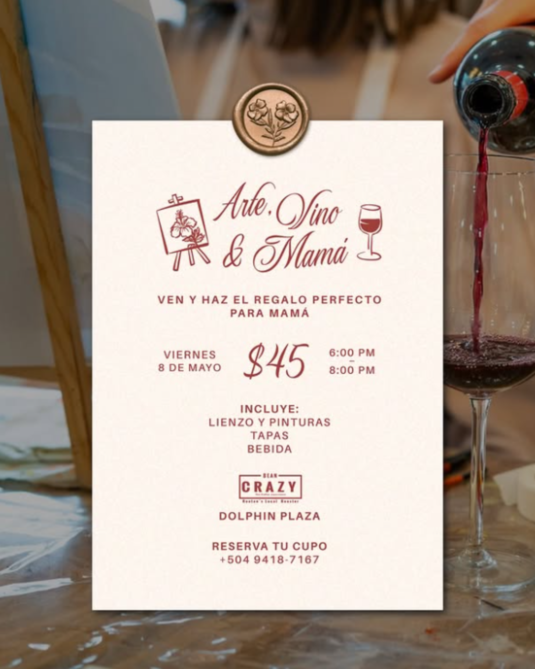 Arte, Vino & Mamá will take place on Friday, May 8, from 6:00 PM to 8:00 PM at Bean Crazy Roatan in Dolphin Plaza. Organized through a collaboration between Arrecife Concept Store and Bean Crazy, the event creates an intimate atmosphere where participants can paint, enjoy wine, and celebrate Mother’s Day in a memorable way.